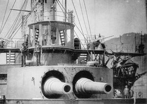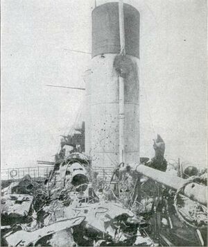 The Russians sailed from south-southwest to north-northeast; "continuing to a point of intersection which allowed only their bow guns to bear; enabling him [Tōgō] to throw most of the Russian batteries successively out of bearing."[42] The Japanese fleet steamed from northeast to southwest, then Tōgō ordered the fleet to turn 180-degrees in sequence, which enabled his ships to take the same course as the Russians. Although Tōgō's U-turn was successful, Russian gunnery had proven surprisingly good and the flagship Mikasa was hit 15 times in five minutes. Before the end of the engagement, she was struck 15 more times by large calibre shells.[8] Rozhestvensky had only two alternatives, "a charge direct, in line abreast", or to commence "a formal pitched battle."[42] He chose the latter, and at 14:08, the Japanese flagship Mikasa was hit at about 7,000 metres, with the Japanese replying at 6,400 meters. Superior Japanese gunnery then took its toll,[43] with most of the Russian battleships being crippled.