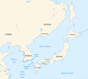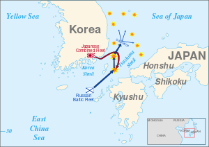 The Russians had three possible routes to enter the Sea of Japan and reach Vladivostok: the longer were the La Pérouse Strait and Tsugaru Strait, on either side of Hokkaido. Admiral Rozhestvensky did not reveal his choice even to his subordinates until 25 May, when it became apparent he chose Tsushima by ordering the fleet to head northeast after detaching transports Yaroslavl, Vladimir, Kuronia, Voronezh, Livonia and Meteor as well as auxiliary cruisers Rion and Dniepr with the instruction to go to the near-by neutral port of Shanghai.[29] The Tsushima Strait is the body of water eastward of the Tsushima Island, located midway between the Japanese island of Kyushu and the Korean Peninsula, the shortest and most direct route from Indochina. The other routes would have required the fleet to sail east around Japan.[ط] The Japanese Combined Fleet and the Russian Second and Third Pacific Squadrons, sent from the Baltic Sea now numbering 38, would fight in the strait between Korea and Japan on the East side of Tsushima Island.[29]