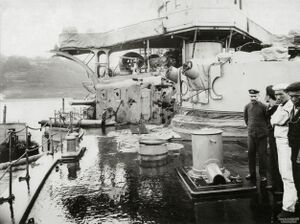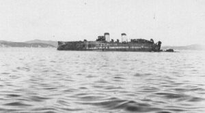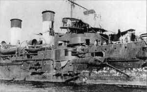 The battleship Sissoi Veliky was badly damaged by a torpedo in the stern and was scuttled the next day. Two old armoured cruisers – Admiral Nakhimov and Vladimir Monomakh – were badly damaged, the former by a torpedo hit to the bow, the latter by colliding with a Japanese destroyer. They were both scuttled by their crews the next morning off Tsushima Island, where they headed while taking on water.[46] The night attacks placed a great strain on the Russians, as they lost two battleships and two armoured cruisers, while the Japanese lost only three torpedo boats.[47]
