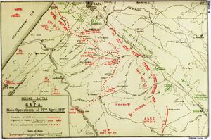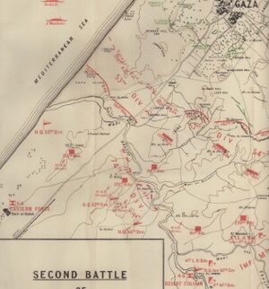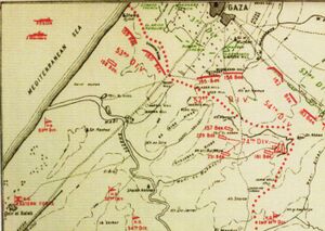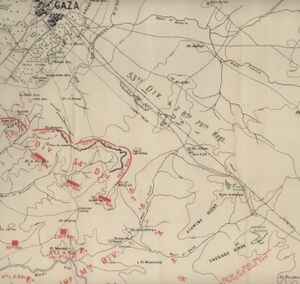 All of the Desert Column mounted and infantry divisions had fought during the first battle of Gaza, when the column's 53rd (Welsh) Division had been heavily involved.[6] This "encounter battle" by the mounted divisions emphasised speed and surprise,[7] at a time when Gaza had been an outpost garrisoned by a strong detachment on the flank of a line stretching inland from the Mediterranean Sea.[8]