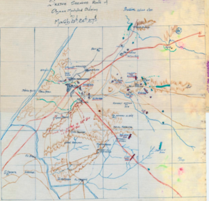 Joseph W. McPherson, an officer in the Egyptian Camel Transport Corps was invited by two Royal Engineer messmates to accompany them on a reconnaissance during the afternoon of Good Friday, 6 April 1917. He subsequently wrote, "we saw parties of Turks and mapped down new trenches they had made, got sniped at incidentally, and had to travel a good bit of the way on our bellies."[27]