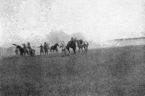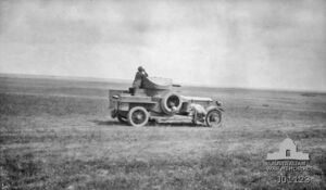 The tanks which arrived in Palestine in January 1917 had been used for instruction and were not of the latest type, however during a trial attack they proved themselves in the sandy conditions. "[T]he sand though fairly heavy, did not interfere with them in the least. They buzzed along most satisfactorily."[57] They worked well in sand so long as the treads were not greased, which was the normal practice.[61] The tank, War Baby was powered by a 105-horsepower engine. It had a revolver, loop holes, periscopes, dynamos and differentiator, and was armed with four Hotchkiss machine guns and two auxiliary guns. This tank was manned by one officer sitting beside the driver, four gunners on bike seats and two greasers.[27]