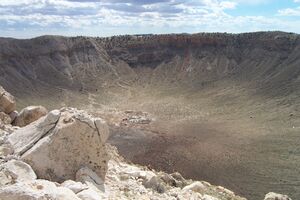 فوهة الارتطام هي أي منخض، طبيعي أو بواسطة البشر، ينتج عن تصادم شديد نتيجة لتعرضه للقذف عن طريق جسم كبير. وفي الاستعمال الشائع، يستخدم المصطلح ليصف المنخفض النتاج عن حدوث ضغط (جيولوجيا)|ضغط على سطح كوكب|الكواكب، القمر، أو أي جسم صلب في النظام الشمسي. Impact craters are typically circular, though they can be elliptical in shape or even irregular due to events such as landslides. Impact craters range in size from microscopic craters seen on lunar rocks returned by the Apollo Program[2] to simple bowl-shaped depressions and vast, complex, multi-ringed impact basins. Meteor Crater is a well-known example of a small impact crater on Earth.[3]
