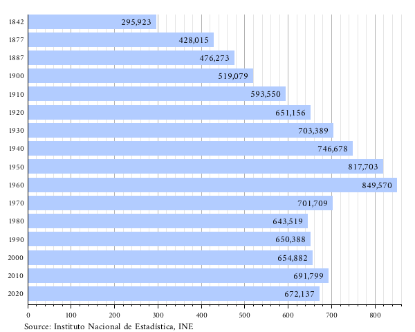 The population in the province of Badajoz has been characterized by a constant growth until the 1960s, when a strong exodus towards more prosperous areas of the country began, mainly Catalonia and Madrid, reducing the population by almost 200,000 inhabitants in a matter of 20 years. Since the 1980s the population has stagnated below 700,000, with a slight growth until 2010, when the trend is again reversed and the province loses population again. If we observe the trend by municipalities, we can see how the municipalities located in the mountains to the east and south of the province are constantly losing population while those located near the population centres of Badajoz, Mérida, Don Benito or Almendralejo are growing.[3]