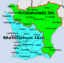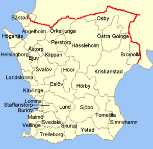 Skåne County is the administrative equivalent of the province of Skåne, but it also includes an insignificant part of the province of Halland.[بحاجة لمصدر]