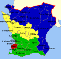 Skåne County contains 33 municipalities[8] (سويدية: kommuner), the largest by population being Malmö Municipality (340,000 inhabitants), Helsingborg Municipality (145,000), Lund Municipality (123,000 inhabitants) and Kristianstad Municipality (85,000 inhabitants). The municipalities have municipal governments, similar to city commissions, and are further divided into parishes. The parish division is traditionally used by the Church of Sweden, but also serves as a divisioning measure for Swedish census and elections.