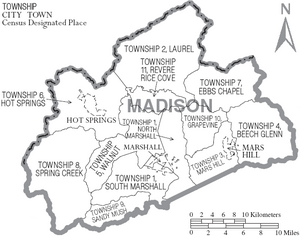 Madison County is located deep in the Appalachian Mountains of western North Carolina, and much of the county's terrain is rugged, heavily forested, and sparsely populated. The county's northern border is with the State of Tennessee. Madison County's largest river is the French Broad River, which flows north-northwest through the county, first past the county seat of Marshall, then past the resort town of Hot Springs.