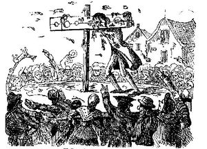 رسم من القرن 18 لشاهد الزور جون والر على المقطرة، وثم رُجم حتى الموت في 1732