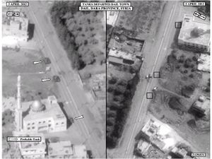 صورة بساتل أمريكي لدبابات سورية تغادر داعل، محافظة درعا، سوريا، بعد أيام من هجومها على المدينة في أبريل 2012.