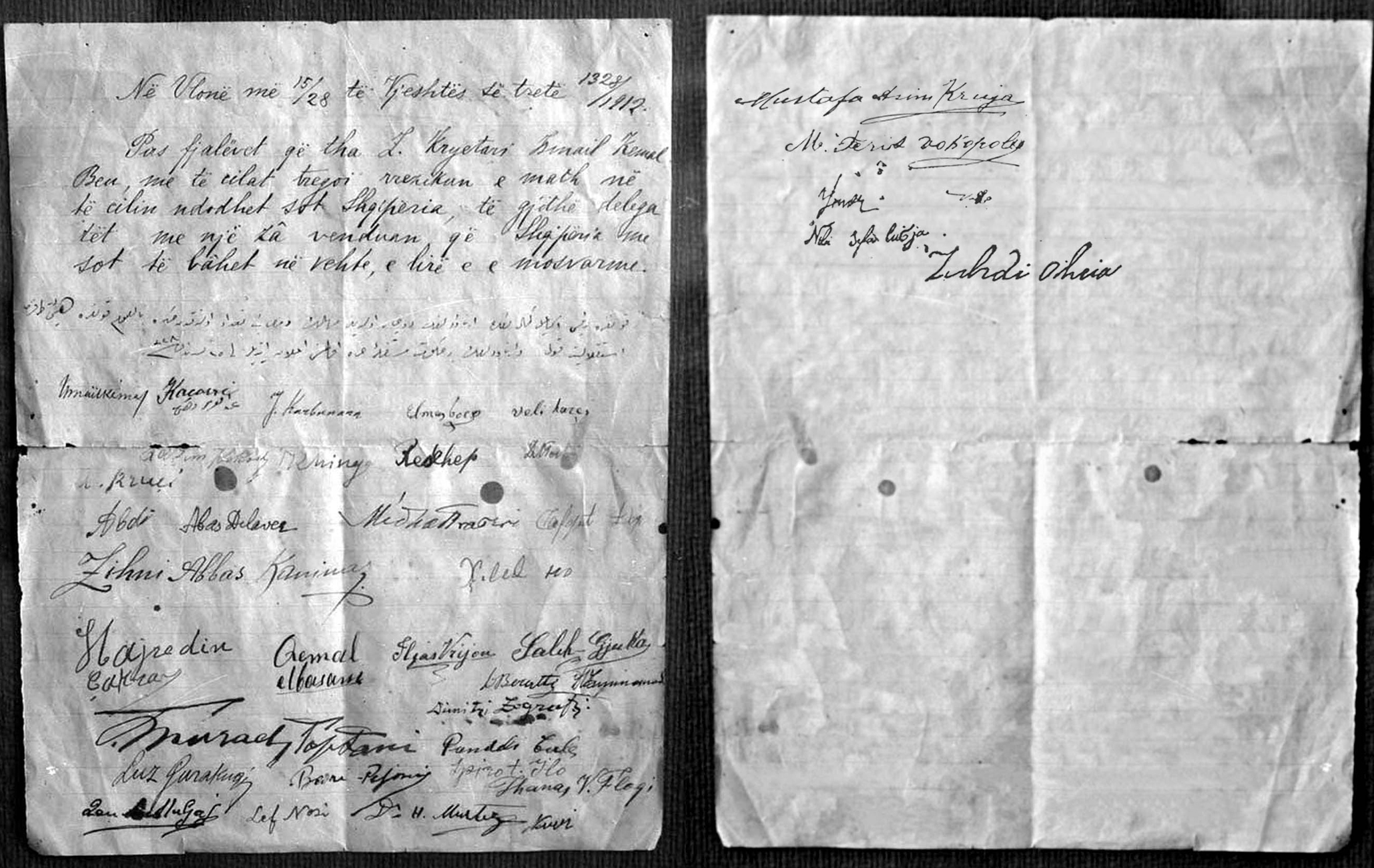 English: Photomontage of the original Act of the Albanian Declaration of Independence. The original document shown here was later in the posession of Lef Nosi, one of the signatories. It is believed to have dissapeared. |