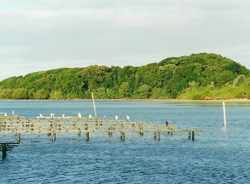 English: Littoral rainforest & oyster farm at Brunswick Heads, Australia. The rainforest features a large Ficus macrophylla in the left centre |