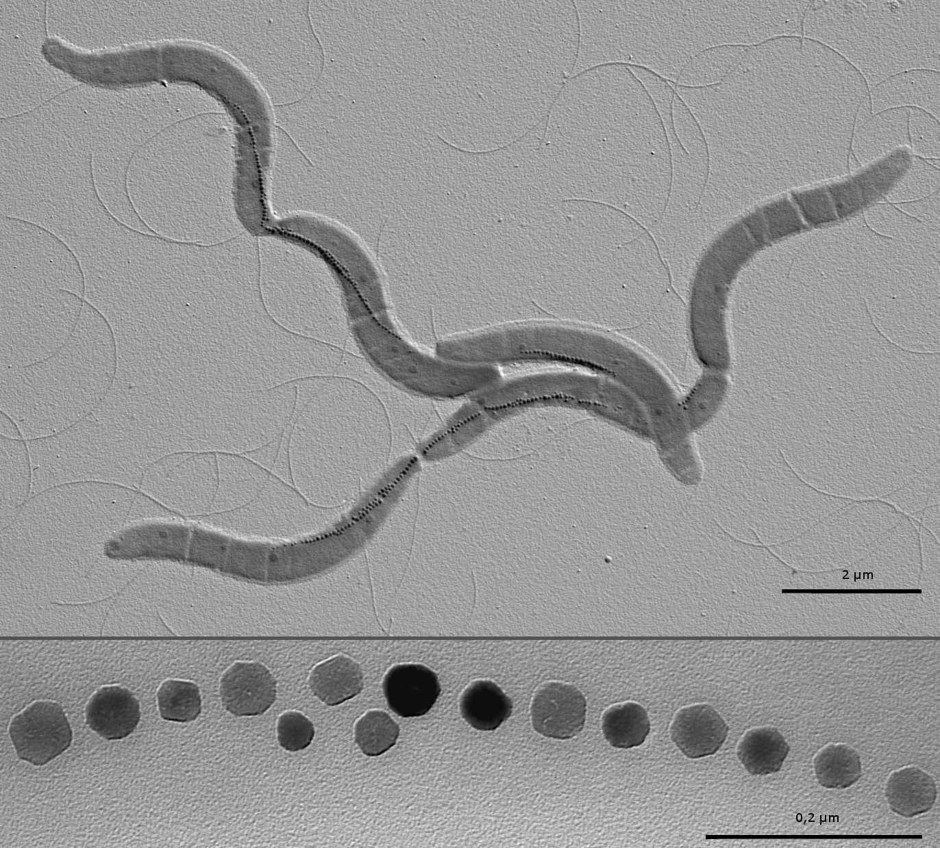 Deutsch: Magnetospirillum gryphiswaldense. Elektronenmikroskopische Aufnahme einiger Zellen mit intrazellulären Ketten aus Magnetitkristallen. Unten: Vergrößerter Ausschnitt einer Kristallkette.