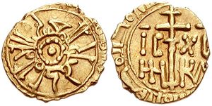 At Mahdia, Roger I and William I minted dinars of pure gold, 22 mm in diameter and weighing 4.15 g with Cufic inscriptions, probably for internal circulation in Africa.[35] The only two known coins were first discovered by the Tunisian scholar H. H. Abdul-Wahab in 1930. They were a close imitation of a type minted by the Fatimid caliph al-Zahir (1020–35) over a century earlier.[36][35] In Fatimid fashion, the coins have inscriptions in two concentric circles with two lines of text in the centre. The circular text is the same on both sides, while the central text differs. In Roger's coin, it reads "Struck by order of the sublime king (al-malik al-muʿaẓẓam) Roger, the powerful through God [Allah], in the city of Mahdia, in the year 543 [of the Hijrah]", that is, 1148/49, in the outer circle and "Praise be to God, it is fitting to praise him and, indeed, He is deserving and worthy [of praise]" in the inner circle. The obverse centre reads "The King Roger", while the reverse centre contains his laqab "The powerful through God" (al-Muʿtazz bi-ʾllāh).[35][37] William's coin is similar, but is dated to is dated to 549 (1154/5) and replaces Roger's Arabic laqab with his own, al-Hādī bi-Amr Allāh ("the Guide according to the command of God").[37] It has been observed that the inscriptions bear a resemblance to those of Robert Guiscard's tarì struck at Palermo in 1072. In both cases the mint would have been staffed entirely by Muslims.[35]