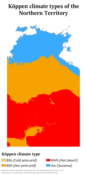 The Northern Territory has two distinctive climate zones. The northern end, including Darwin, has a tropical savannah climate (Köppen Aw)[25] with high humidity and two seasons, the wet (October to April) and dry season (May to September). During the dry season nearly every day is warm and sunny, and afternoon humidity averages around 30%. There is very little rainfall between May and September. In the coolest months of June and July, the daily minimum temperature may dip as low as 14 °C (57 °F), but very rarely lower, and frost has never been recorded.
