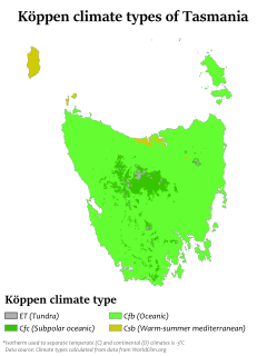 | Burnie[49] | Cfb | 21 °C (70 °F) | 13 °C (55 °F) | 13 °C (55 °F) | 6 °C (43 °F) | 52 | 958 mm (38 in) |