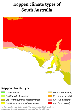 | Port Augusta[44] | BWh | 34 °C (93 °F) | 19 °C (66 °F) | 18 °C (64 °F) | 5 °C (41 °F) | 142 | 218 mm (9 in) |