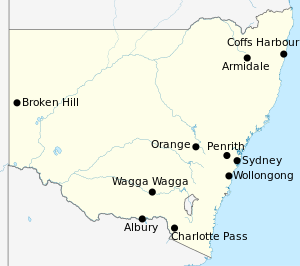 | Coffs Harbour[17] | Cfa | 27 °C (81 °F) | 19 °C (66 °F) | 19 °C (66 °F) | 8 °C (46 °F) | 122 | 1،679 mm (66 in) |