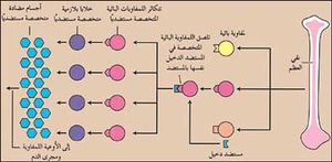 أنواع خاصة من خلايا الدم البيضاء. ومثل بقية خلايا الدم البيضاء تنتج اللمفاويات في نقي العظم، أي النسيج المكوِّن للدم في مراكز العديد من العظام. وتنضج بعض اللمفاويات في نقي العظم، وتصبح لمفاويات بائية، تسمى أيضًا الخلايا البائية. وتتطور بعض هذه الخلايا إلى خلايا بلازمية وظيفتها إنتاج الأجسام المضادة، وهي بروتينات تهاجم المستضدات، وتنقل عبر الدم والدموع وإفرازات الأنف والأمعاء.