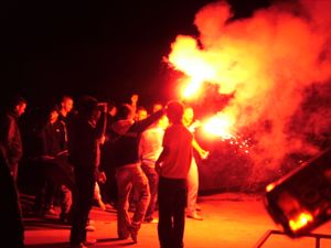 A Croatian crowd celebrate with flares following Croatia's victory over Germany in 2008.
