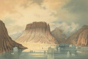 Painting (1900ح. 1900) of the Teufelsschloss in Kaiser-Franz-Joseph-Fjord, East Greenland. The site is now part of the Northeast Greenland National Park.