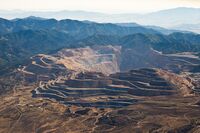 At 9:30 pm on April 10, 2013, a landslide occurred at the mine. Around 2.3–2.5 billion أقدام مكعبة (65×106–70×106 m3) of dirt and rock thundered down the side of the pit.[18] It is possibly the largest historic non-volcanic landslide in North America.[19][20][21] On the basis that the mine's steep walls made it a high risk for landslides, an interferometric radar system had been previously installed to monitor the ground's stability. As a result of warnings produced by this system, mining operations had been shut down the previous day in anticipation of the slide and there were no injuries.[22] The massive slide was expected to cut production of mined copper by 100،000 طن متري (98،000 long ton; 110،000 short ton).[23] A second slide caused an evacuation of 100 workers on September 11, 2013.[24] Another, less severe slide occurred on May 31, 2021.[25]