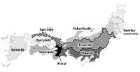 Map showing the Kansai region of Japan. It comprises the mid-west area of the island of Honshu.