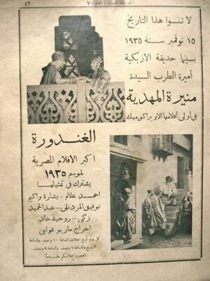 كانت منيرة المهدية تكتب على الأفيشات «الممثلة الأولى «بالرغم من أنها كانت تقوم بدور رجل ثم انفصلت عن فرقة عزيز عيد وكونت فرقة خاصة بها وقدمت أشهر أعمال الشيخ سلامة حجازي. كما عملت مع أشهر شعراء وملحّني جيلها وكان لها الفضل في اكتشاف الموسيقار محمد عبد الوهاب. قامت منيرة المهدية ببطولة فيلم «الغندورة» عام 1935 وهو الفيلم الوحيد لها وكان من إخراج المخرج الإيطالي فولبي.
