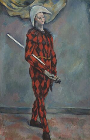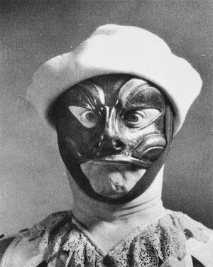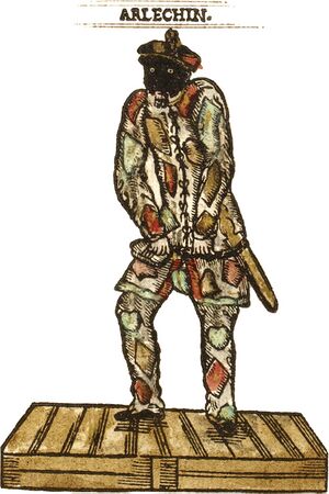 Early characteristics of Arlecchino paint the character as a "second" Zanni servant from northern Italy with the paradoxical attributes of a dimwitted fool and an intelligent trickster.[5][11] Arlecchino is sometimes referred to as putting on a show of stupidity in a metatheatrical attempt to create chaos within the play.[11] Physically, Arlecchino is described as wearing a costume covered in irregular patches, a hat outfitted with either a rabbit or fox's tail, and a red and black mask.[5] The mask itself is identified by carbuncles on the forehead, small eyes, a snub nose, hollow cheeks, and sometimes bushy brows with facial hair.[5] Arlecchino is often depicted as having a wooden sword hanging from a leather belt on his person,[5] and sometimes holding a marotte (fool's scepter).[26] Aside from his acrobatics, Arlecchino is also known for having several specific traits such as: