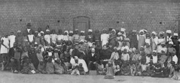 دكتور پيتر ستوفبرگ والمعلمين مع تلاميذ الإرسالية في موتشودي. عقب حرب البوير الثانية.
