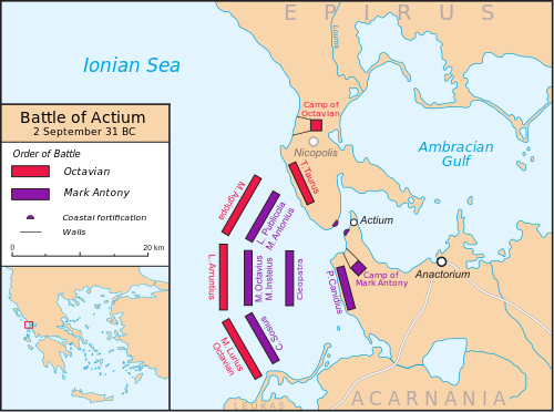 معركة أكتيوم Battle of Actium كانت الاشتباك الحاسم في آخر حروب الجمهورية الرومانية بين قوات اوكتاڤيان ضد القوات المشتركة لكل من مارك أنتوني وكليوپاترا. وقد نشبت في 2 سبتمبر 31 ق.م.، في البحر الأيوني بالقرب من المستعمرة الرومانية أكتيوم Actium في اليونان. أسطول اوكتاڤيان كان يقوده ماركوس ڤيپسانيوس أگريپـّا, بينما أسطول أنطونيو كان مدعوماً من أسطول محبوبته، كليوپاترا السابعة، ملكة مصر البطلمية.