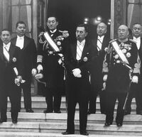 Emperor Shōwa (Hirohito) trusted Yonai's strong moral character. By July 1944, the situation of World War II was apparently against Japan. As for this difficult circumstance, the Imperial Japanese Navy was in a confusion. Supreme commanders of the Imperial Japanese Navy decided to appoint Yonai as the Minister of Navy because he had popularity and charisma enough to unite the Imperial Japanese Navy, although Yonai had already retired. To assign Yonai as the Minister of Navy, the Emperor's consent was necessary. Meanwhile, Admiral Suetsugu was also a candidate. The Emperor selected Yonai because Suetsugu was famous for his ambition, and allowed Yonai to be the Minister of Navy even though he was no longer in active service. This appointment demonstrated Shōwa's trust in Yonai because he is the only one person in the Imperial Japanese Navy's history to return from retirement and be posted to the supreme position as the Minister of Navy. After the Imperial Japanese Navy was defeated, the Emperor called Yonai to the palace. The Emperor amiably invited Yonai to have lunch together. After that, the Emperor said, "I really appreciated your duty and effort not to begin the war. I think we are not going to meet often like before". He put a pen and inkstone into a case and said, "These are the things that I have used. I would like to present this as a gift to you."[11] This action is extremely rare because having presented the belongings of the Emperor is the supreme honor and the utmost expression of amiability.[9]