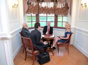 ميجان كلي تجري لقاءً صحفياً مع الرئيس الروسي ڤلاديمير پوتن ورئيس الوزراء الهندي نارندرا مودي على هامش منتدى الأعمال الدولي في سانت پطرسبورگ، روسيا، 1 يونيو 2017. ملخص انطباعها عن پوتن: أنه عدائي وغاضب، وتؤثر فيه التصرفات.