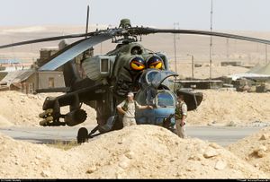 The Russian military has selected this upgraded Mi-24 to be their primary attack helicopter. The PN version has a TV and a FLIR camera located in a dome on the front of the aircraft. Other modifications include using the rotor blades and wings from the Mi-28 and fixed rather than retractable landing gear. The Russians received 14 Mi-24PNs in 2004 and plan on eventually upgrading all of their Mi-24s.[3]