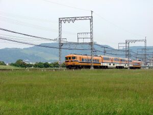 Kintetsu Limited Express passing through the Heijo Palace ruins. Mt.Wakakusa and Todaiji Temple are in the background.