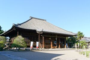 With the establishment of the new capital, Asuka-dera, the temple of the Soga clan, was relocated within Nara.[20] The Emperor Shōmu ordered the construction of Tōdai-ji Temple (largest wooden building in the world) and the world's largest bronze Buddha statue.[16] The temples of Nara, known collectively as the Nanto Shichi Daiji, remained spiritually significant even beyond the move of the political capital to Heian-kyō in 794, thus giving Nara a synonym of Nanto (南都 "the southern capital").