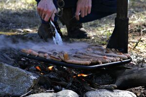 Campfires have been used for cooking since time immemorial. Possibly the simplest method of cooking over a campfire and one of the most common is to roast food on long skewers that can be held above red glowing embers, or on the side near the flames (not over flames in order to avoid soot contamination and burnt food). This is a popular technique for cooking hot dogs or toasting marshmallows for making s'mores. This type of cooking over the fire typically consists of comfort foods that are easy to prepare. There is also no clean up involved unlike an actual kitchen.[22] Another technique is to use pie irons—small iron molds with long handles. Campers put slices of bread with some kind of filling into the molds and put them over hot coals to cook. Campers sometimes use elaborate grills, cast iron pots, and fire irons to cook. Often, however, they use portable stoves for cooking instead of campfires.