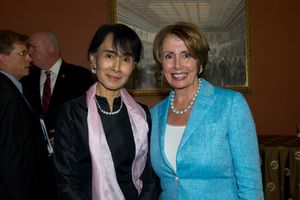 پلوسي تكرم أون سان سو تشي في مراسم وسام الكونگرس الذهب. تدعم پلوسي التحركات الديمقراطية في مختلف أنحاء العالم.
