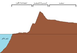 وتنخفض نجد تدريجياً من الغرب إلى الشرق. وقد سمي الجزء الجنوبي المرتفع والمحاذي لجبال الحجاز تاريخياً باسم "العالية" أو "عالية نجد"، بينما تسمى الأرجاء الشمالية المتاخمة للعراق بـ"نجد السفلى".[4]
