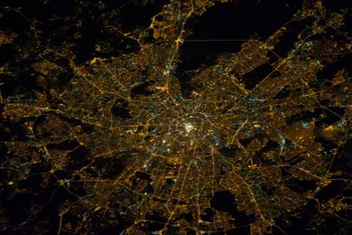 Temperatures in the centre of Moscow are often significantly higher than in the outskirts and nearby suburbs, especially in winter. For example, if the average February temperature in the north-east of Moscow is −6.7 °C (19.9 °F), in the suburbs it is about −9 °C (16 °F).[67] The temperature difference between the centre of Moscow and nearby areas of Moscow Oblast can sometimes be more than 10 °C (18 °F) on frosty winter nights.