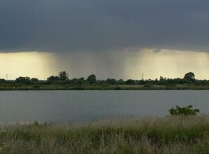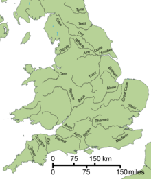 Rainfall in the catchment generally follows topography[48] with the highest annual rainfall of 1،450 mm (57 in) and above occurring over the high moorland uplands of the Derwent headwaters to the north and west, with the lowest of 580 mm (23 in), in the lowland areas to the north and east.[49] Rainfall totals in the Tame are not as high as would be expected from the moderate relief, due to the rain shadow effect of the Welsh mountains to the west, reducing amounts to an average of 691 mm (27.2 in) for the tributary basin.[48][50] The average for the whole Trent catchment is 720 mm (28 in) which is significantly lower than the average for United Kingdom at 1،101 mm (43.3 in) and lower than that for England at 828 mm (32.6 in).[51][52][53]