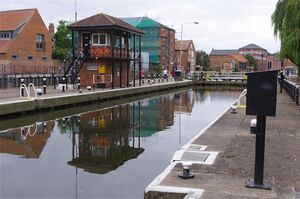 It then reaches the town of Gainsborough with its own Trent Bridge. The river frontage in the town is lined with warehouses, that were once used when the town was an inland port, many of which have been renovated for modern use. Downstream of the town the villages are often named in pairs, representing the fact that they were once linked by a river ferry between the two settlements. These villages include West Stockwith and East Stockwith, Owston Ferry and East Ferry, and West Butterwick and East Butterwick.[13][14][15] At West Stockwith the Trent is joined by the Chesterfield Canal and the River Idle and soon after enters Lincolnshire fully, passing to the west of Scunthorpe. The last bridge over the river is at Keadby where it is joined by both the Stainforth and Keadby Canal and the River Torne.[11]