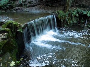 The Trent passes over a man-made waterfall in Hollin Wood just downstream from its source