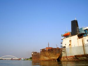 Derelict vessels and a bridge over the Karun in Khorramshahr