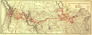 Construction began in 1870 and the main line opened all the way from the Great Lakes to the Pacific when President Ulysses S. Grant drove in the final "golden spike" in western Montana on September 8, 1883. The railroad had about 6،800 ميل (10،900 km) of track and served a large area, including extensive trackage in the states of Idaho, Minnesota, Montana, North Dakota, Oregon, Washington, and Wisconsin. In addition, the NP had an international branch to Winnipeg, Manitoba, Canada. The main activities were shipping wheat and other farm products, cattle, timber, and minerals; bringing in consumer goods, transporting passengers; and selling land.