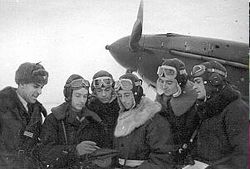 - ^ For a short time members of the Nos. 81 and 134 RAF squadrons of the No. 151 Wing RAF كان متمركزاً في مورمانسك أثناء سبتمبر-اكتوبر 1941 التي قامت بقوافل غطاء جوي ولاحقاً تدريب تحويل الطيارين لتدريب طياري سلاح الجو للجيش الأحمر على الطائرة هوكر هيوريكين، الذين أسقطوا 15 طائرة ألمانية مقابل خسارة طائرة هيوريكين واحدة.