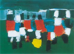 وفي عام 1952، بعد أن شاهد مباراة في كرة القدم، اهتم بهذه اللعبة، ورسم لوحات عدة بمقاسات كبيرة اقترب بها من التشبيهية. وامتازت هذه الأعمال بحركات اللاعبين العنيفة وبالألوان النضرة والسخية، وبالاهتمام بالإنارة التي أضفت على المشاهد طابعاً خيالياً. وكان يسود في هذه اللوحات لونان اثنان في أغلب الأحيان هما: الأزرق المائل إلى السواد، والأحمر الصاخب، وبينهما لمسات زهرية أو زرقاء، صفراء أو سمراء، موزعة على سطح اللوحة.