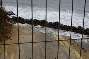 The view of the cliffs from the end of Beach Road showing the precarious position of several houses, as the cliffs are being eaten away by coastal erosion.