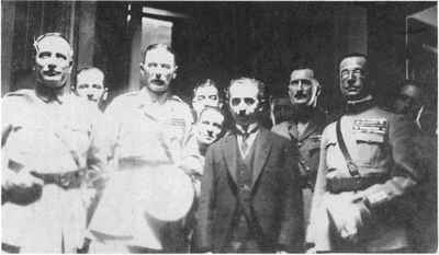 أثناء مفاوضات هدنة مدانية، من اليسار إلى اليمين: الجنرال الفرنسي شارل أنطوان شارپي، الجنرال البريطاني تشارلز هارنگتن، عصمت إينونو، والجنرال الإيطالي إرنستو مون‌بـِلـّي. 3-11 أكتوبر 1922.