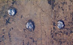 ثلاثة من التلال المونترجية الوسطى (من اليسار: Mont Saint-Hilaire, Mont Rougemont وMont Yamaska) كما يبدون من الفضاء.