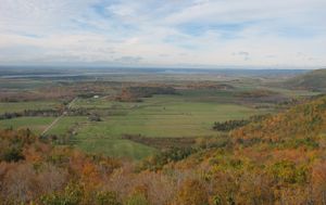 نهر اوتاوا يعبر وادي اوتاوا بالقرب من مدينة اوتاوا. في المقدمة، سفوح تلال گاتينو يشكلون جزءاً من الطرف الجنوبي من الدرع الكندي